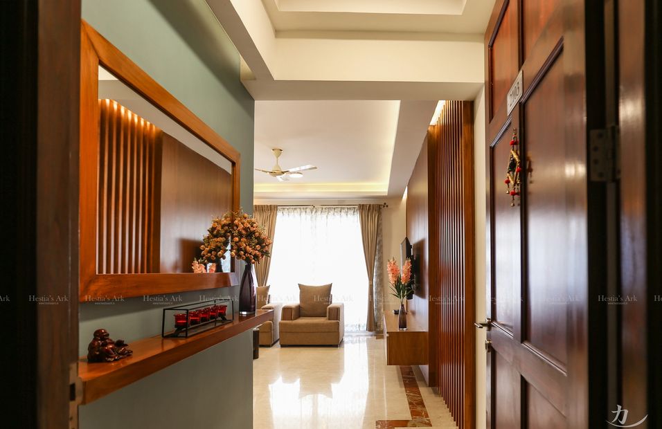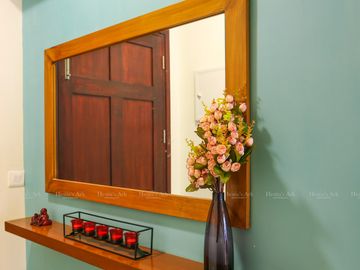 Custom-made Foyer Mirror and Ledge: Antique teak wood finish frame that blends to the pastel background and the free standing ledge with select accessories giving a warm welcome to your guests.