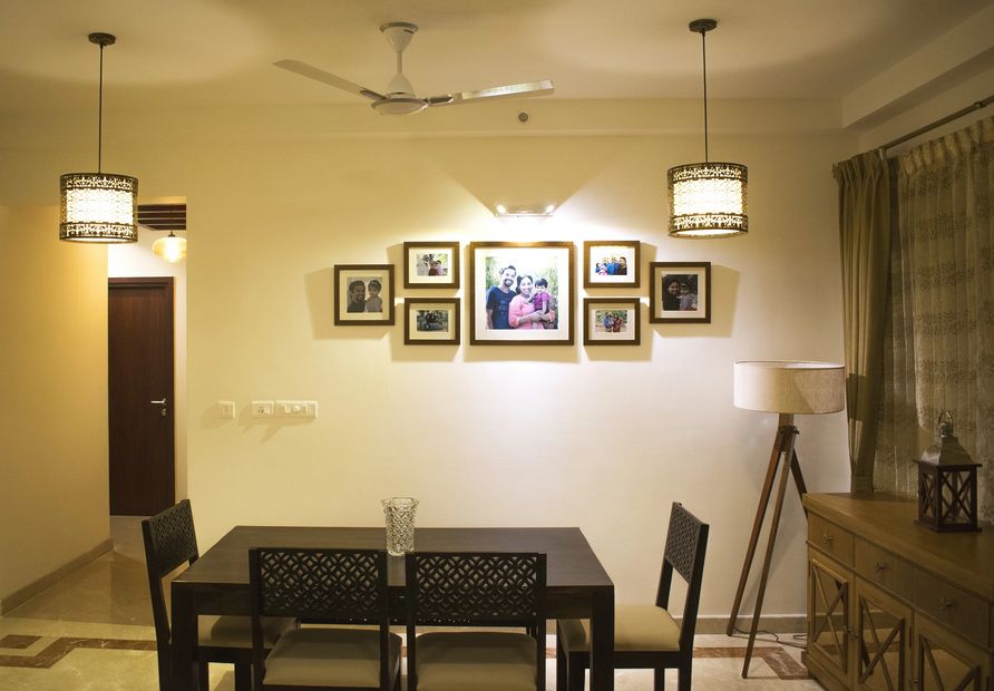 Bring effortlessly rustic grace and simple utility to any dining space with this timeless combination of carefully curated table and slotted chairs complemented by the straight lines of dining sideboard, classic pendant lights and vintage tripod lamp. The family memories highlighting the wall makes it an intimate mealtime.