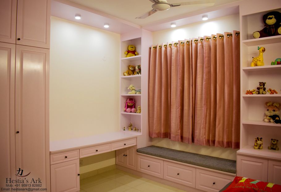 Shades of pink setting tone for the Kid's Bedroom. Lacquer finish on cabinetry gives a rich and glossy coating that determine the personality of the environment. A mixture of pink curtains and the window seating gives an informal element to the layout..
