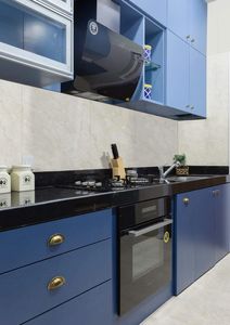 Practical design with a smart custom cabinetry and profile handles, this kitchen has a spacious layout. The theme follows the line of light tones with the charm of sky blue that contrast with the quartz counter-top.