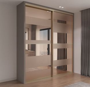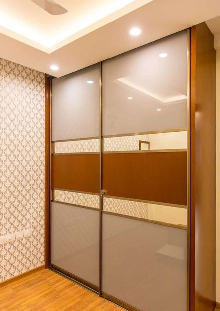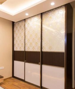 This full-length sliding wardrobe in acrylic with mirror and veneer highlight accentuates the wooded flooring and the textured wallpaper on adjoining wall.