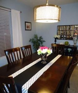 A modern but traditional style dining room with natural light streams through the windows blinds and a wooden dining buffet lighted by a unique white pendant.