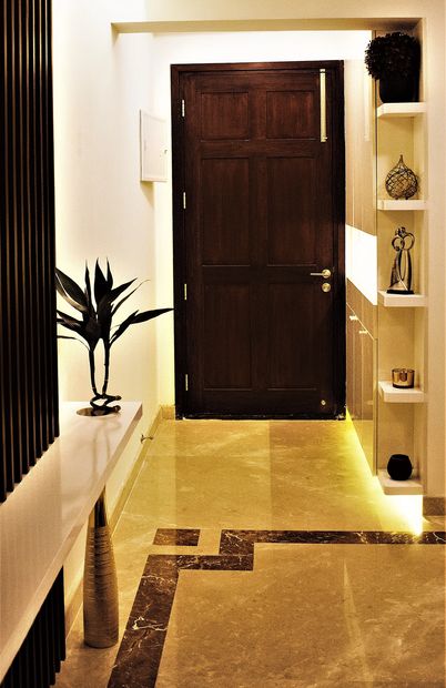 Innovative design approach with combination of color scheme and lighting camouflages the shoe rack and gives the entry way a bright modern appearance with ample display space.