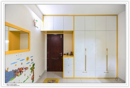 Use of bright yellow with wall art gives a cheerful character to this kids bedroom. White color embellished with yellow for wardrobe with golden flat handles adds class to the play.