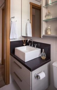 Going vertical in this tight space has ensured a good sized mirror and storage space. with ample under-counter vanity shelf.