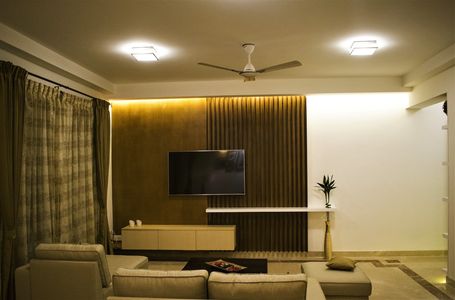 This minimalist TV backdrop in polished veneer with floating ledge and cantilevered cabinet complimented by cove lighting gives a classy finish to living room.