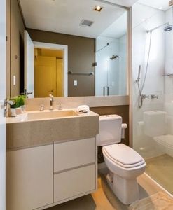Elegant toilet with straight lines, natural light and a large mirror. The colors follow the predominant hue of the entire house .